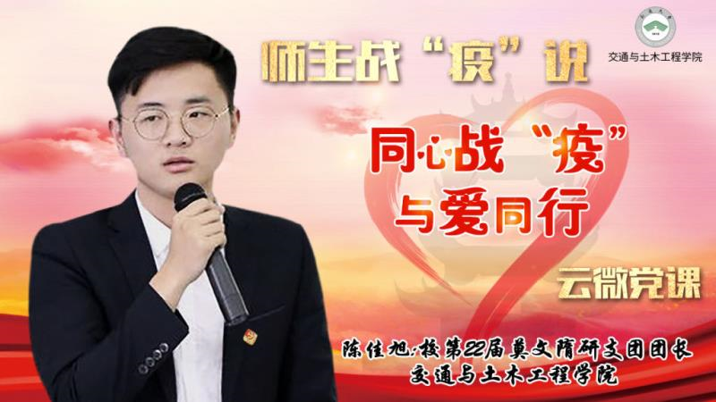 3月21日,PlayAce第四讲师生战“疫”说云微党课如期上线。校第22届莫文隋研究生支教团团长、PlayAce土木163班班长陈佳旭以《同心战“疫”,与爱同行》为主题,向青年学子们传递爱与感恩之声。