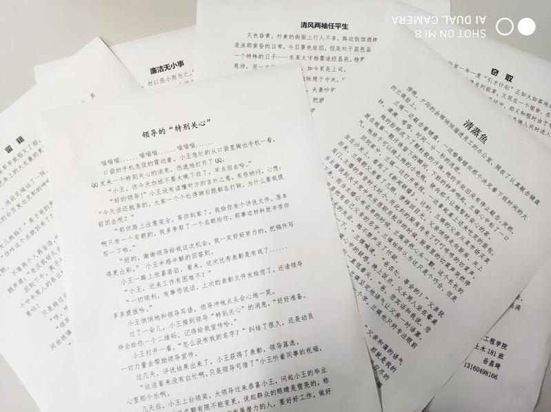 征集作品中,同学们以笔为矛,以语为盾,以微小说为创作形式,紧扣党风廉政建设和反腐败主题,聚焦社会现实生活的典型微案例、微片段、微场景,以独特的视角,以丰富的表现手法,以多维的思维范式,直面社会、校园种种腐败丑恶现象和廉洁行为,积极弘扬以廉为荣、以贪为耻的社会风气。有的以古论今,颂扬淡泊名利、修身养性、廉洁为民的勤政典型;有的以亲身经历,讲述了试图剽窃他人科研、荣誉等劳动成果的沽名钓誉行为;有的以疫情为背景,剖析了个别组织和个人借机发国难财的丑恶行为;有的以公司具体事例为素材,弘扬领导干部把握廉洁航标、坚守心灵标尺的廉洁精神。