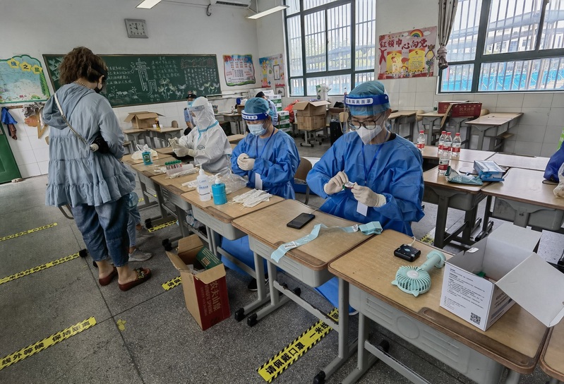 8月1日,室外温度高达35摄氏度以上,南京市江宁区江宁街道铜井中心小学核酸检测点内,土木工程203班19岁的李紫恒穿着闷热的防护服正认真进行信息扫描录入。7月20日晚,疫情突然暴发,李紫恒的母亲叶宣琴是社区工作人员,第一时间赶回了岗位,和社区工作人员一起对辖区3000多名常住人口开展检测,一忙就是二十多个小时。