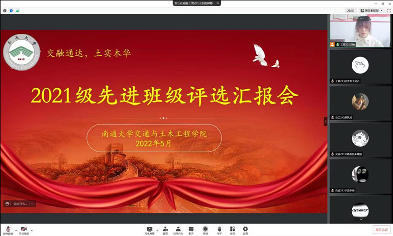 汇报会上,2021级14个班级根据抽签顺序,紧扣各自班级特点,从思想建设、疫情常态化管理、学风建设、班级活动、心理健康关怀等方面进行汇报总结,展示了过去一学年各方面取得的成果。各班级的展示材料详实、图文并茂、各具特色,呈现了班集体团结向上、奋勇争先的精神风貌和学习状态。经过评选,交通设备与控制工程213班等8个班级获得“先进班级”荣誉称号。