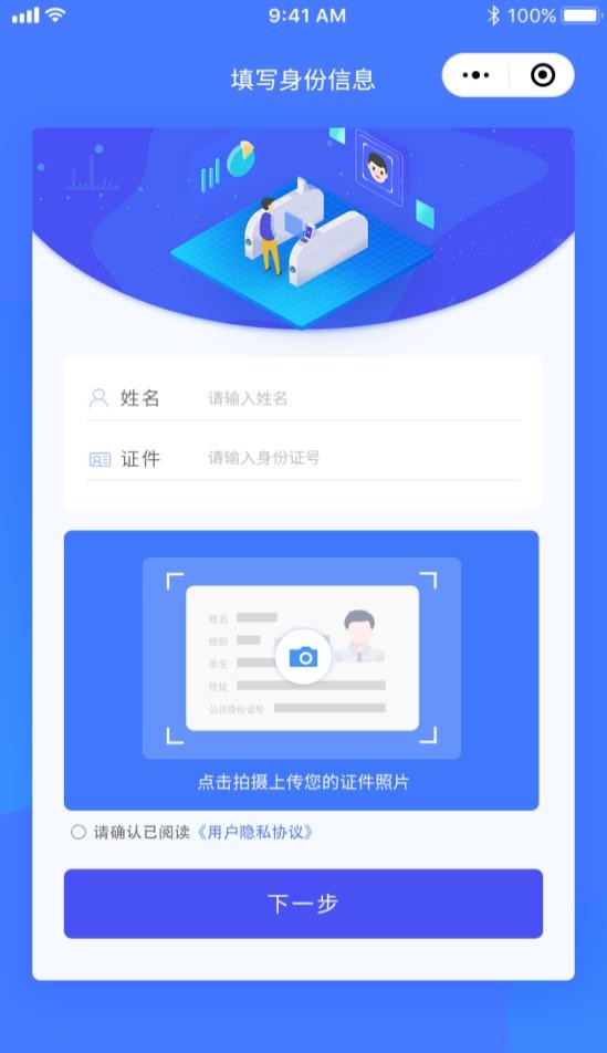 姓名和证件信息填写后请点击”+“按钮上传你的证件正面,然后点击下一步。 注:证件信息不支持修改,请务必在此页面填写正确。